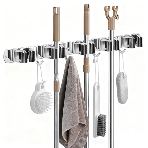 Ai-Yong Heng Wandhalterung Besen & Gartengeräte: Edelstahl Besenhalterung Wand mit 5 Klemmen + 4 Haken – Selbstklebend oder Bohren – Organizer für Garage, Garten, Haushalt.