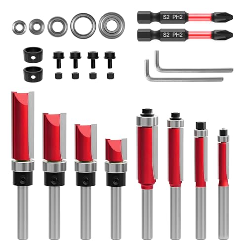 Das Set besteht aus 10 Bündigfräsern mit einem Schaftdurchmesser von 8 mm, die ideal zum Schneiden und Fertigen von Holzplatten verwendet werden können.