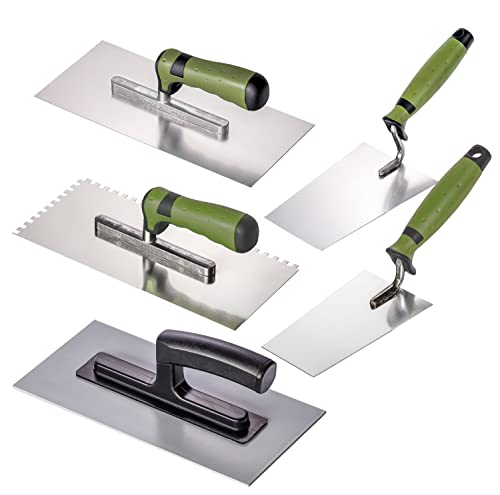 Lieferumfang: Colorus Stuckateur Werkzeug Set 5 tlg. bestehend aus 1 x Zahnkelle 280 x 130 mm mit 6 mm Zahnung, 1 x Glättekelle 280 x 130 mm, 1 x Stuckateurkelle 160 mm, 1 x Berner Putzkelle 140 mm und 1 x Glättekelle Kunststoff 280 x 140 mm