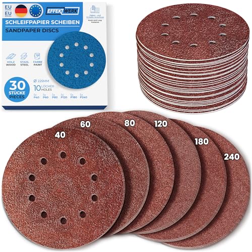 Effektwerk Schleifscheiben (30er-Pack, 10 Löcher), 225 mm Schleifpapier für Fein- und Grobschliff, verschiedene Körnungen 40/60/ 80/120/180/240 (je 5 Stück)