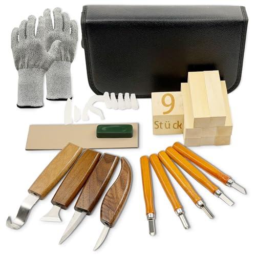 Das Set enthält 9 Werkzeuge, 9 Lindenholzblöcke, einen Schleifriemen, Polierpaste, 2 Schnittschutzhandschuhe und eine Lederrolle. Die Werkzeuge sind sicher für Jugendliche und Erwachsene geeignet, da sie mit einem rutschfesten Holzgriff und Fingerschutz ausgestattet sind.