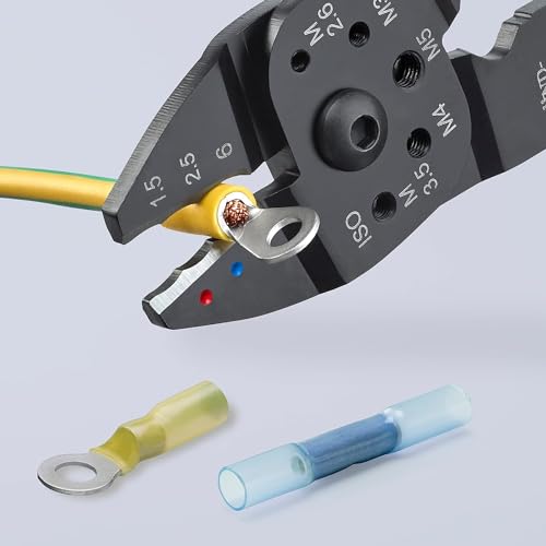 - Zum Kabelschneiden, Abisolieren von Adern und Crimpen von isolierten Kabelschuhen und isolierten Schrumpfschlauchverbindern