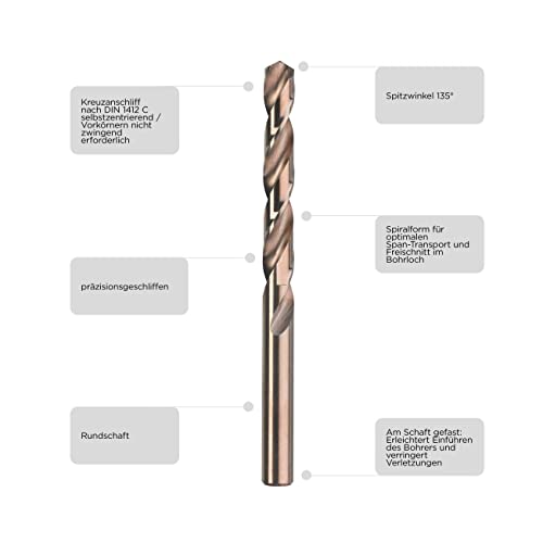 Die rechtsschneidenden, brozenen Stahlbohrer sind durch ihre spezielle Stahlzusammensetzung aus HSS und 5% Cobalt sehr langlebig und widerstandsfähig gegen Hitzeeinwirkung.