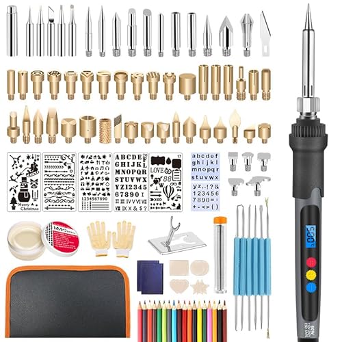 Das Set enthält 110 Teile, darunter 1 x 2 in 1 Lötkolben Holzbrennstift mit hitzebeständiger Kappe, 41 x sortierte Holzbrenn- und Lötspitzen, 1 x Klinge, 7 x Mustervorlagen, 18 x bunte Bleistifte, 1 x Zange, 8 x Brandmalereitafeln, 1 x Mini Lötkolbenhalter, 1 x Schwamm und weitere Zubehörteile.