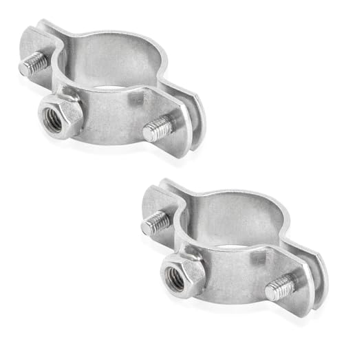 Die Rohrschellen sind mit einer angeschweißten Anschlussmutter versehen und werden inklusive Sechskantschrauben und Muttern geliefert. Die Befestigung an der Wand sowie die Befestigung der Rohre selbst erfolgt durch die beiden Klemmschrauben und Muttern, mit deren Hilfe die Schellen sicher verschlossen werden.