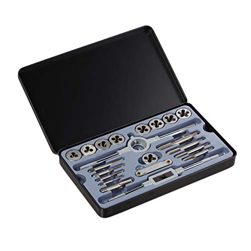 Relaxdays Gewindeschneider M3 – M12, 9 Schneideisen & Gewindebohrer, Windeisen, Gewindelehre, Schneideisenhalter, silber