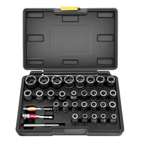 - Besitzt 32 Werkzeuge: 29 Nussextraktoren in verschiedenen Größen, einen 3/8-Zoll Adapter, einen 1/4-Zoll Adapter und eine Abgabestange