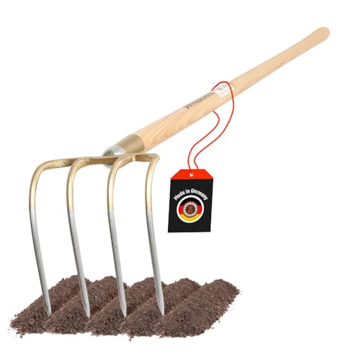 SHW-FIRE | Kartoffelhacke 4 Zinken Schmiedung, 135 cm ergonomischer Eschenholzstiel, robust & langlebig, ideal für Bodenbearbeitung, Kartoffelernte & Heuaufnehmen | Made in Germany
