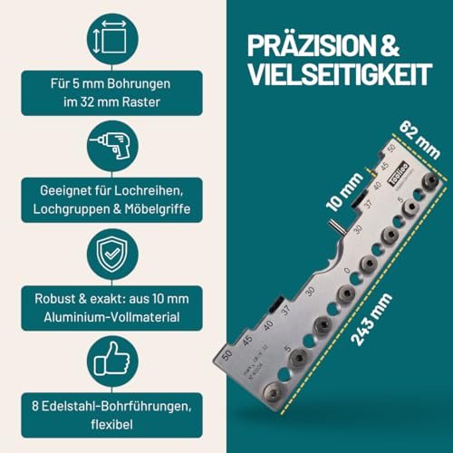 Die robuste Konstruktion aus hochwertigem Aluminium-Vollmaterial gewährleistet eine höchste Stabilität und Langlebigkeit. Perfekt geeignet für Lochreihen, Bohrgruppen und Möbelverbinder nach Industriestandard.