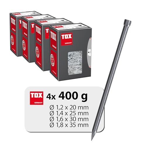 • Lieferumfang: TOX Drahtstifte Nails in 4 Größen (1,2×20 / 1,4×25 / 1,6×30 / 1,8×35 mm) mit Senkkopf, blanker Stahl, jeweils 400 g im Karton