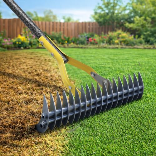 Dieser Vertikutierer Rechen mit Stiel besteht aus hochwertigem Carbonstahl, dessen Zinken auch in verdichtetem Boden stabil bleiben und sich nicht verbiegen. Der verstärkte 2,8 cm Griff sorgt für maximale Stabilität ohne Wackeln.